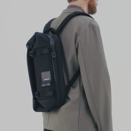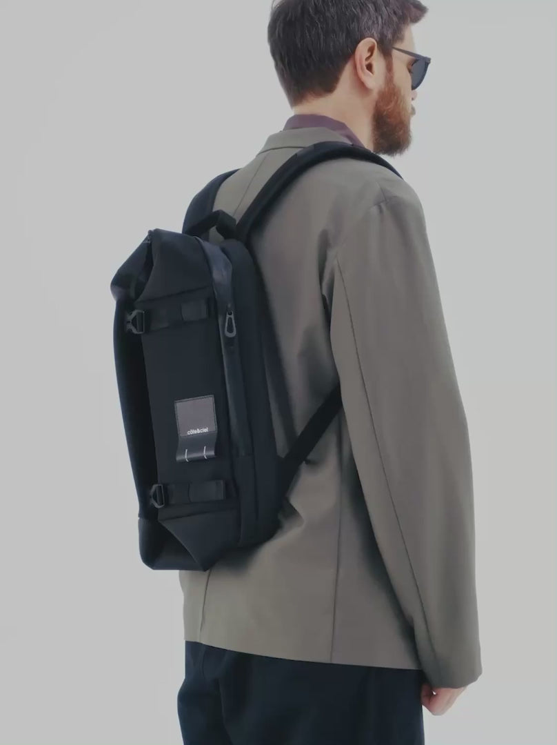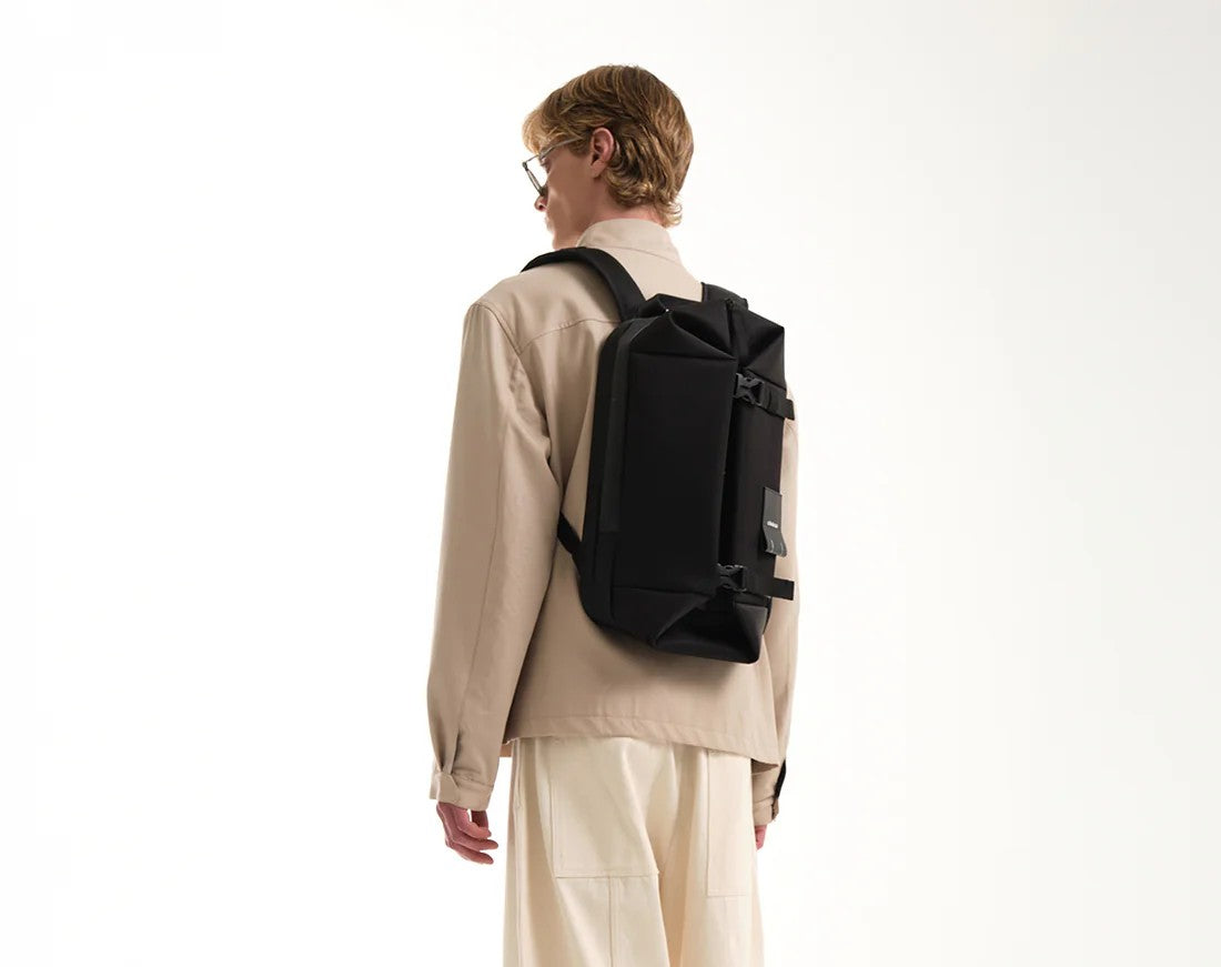 The YUKON returns in our iconic Sleek Black material. A compact backpack with a surprising feature: being able to open the front two buckles allowing the cubic-shaped front compartment to expand to full capacity. The extra-comfortable straps are padded with mesh panelling on both sides and feature a detachable chest strap. The padded device pocket in the rear compartment can hold a laptop up to 14".